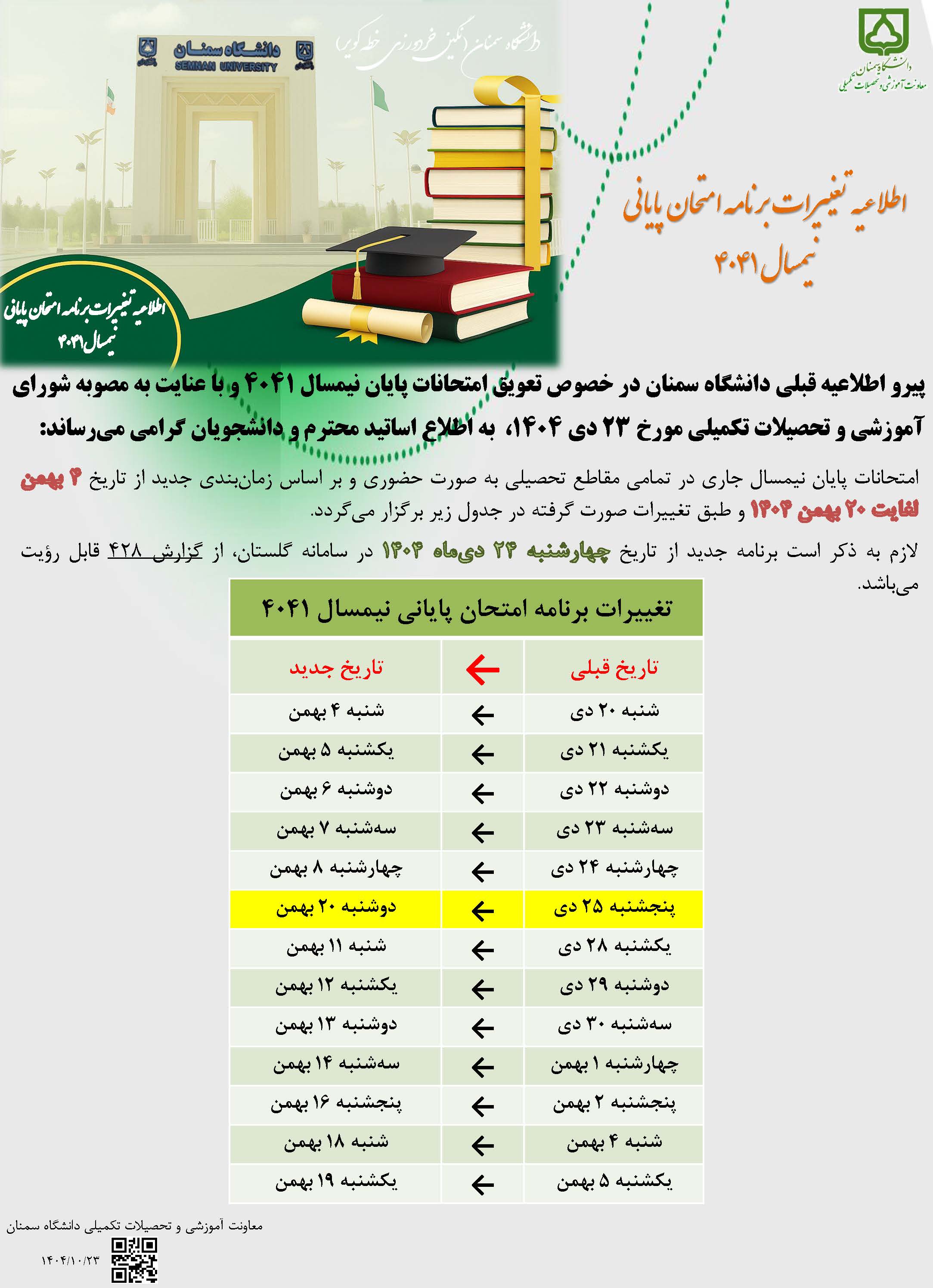 اطلاعیه تغییرات برنامه امتحانات پایانی نیمسال 4041